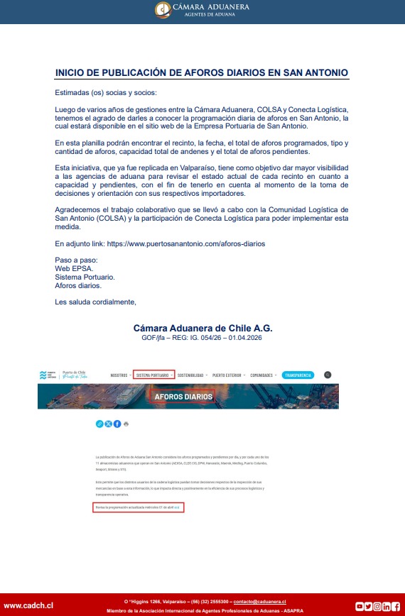 Gracias al trabajo articulado entre COLSA, Aduana de San Antonio, Puerto San Antonio, Cámara Aduanera de Chile, Asociación Nacional de Agentes de Aduana, ANAGENA A.G., y Almacenes Extraportuarios, apoyados por Conecta Logística, a 𝗰𝗼𝗻𝘁𝗮𝗿 𝗱𝗲l 1 de abril 𝘆 𝗲𝗻 𝗳𝗼𝗿𝗺𝗮 𝗱𝗶𝗮𝗿𝗶𝗮 estarán publicados en el sitio web de EPSA los 𝗮𝗳𝗼𝗿𝗼𝘀 programados y pendientes por los 𝟭𝟮 𝗮𝗹𝗺𝗮𝗰𝗲𝗻𝗶𝘀𝘁𝗮𝘀 presentes en San Antonio: